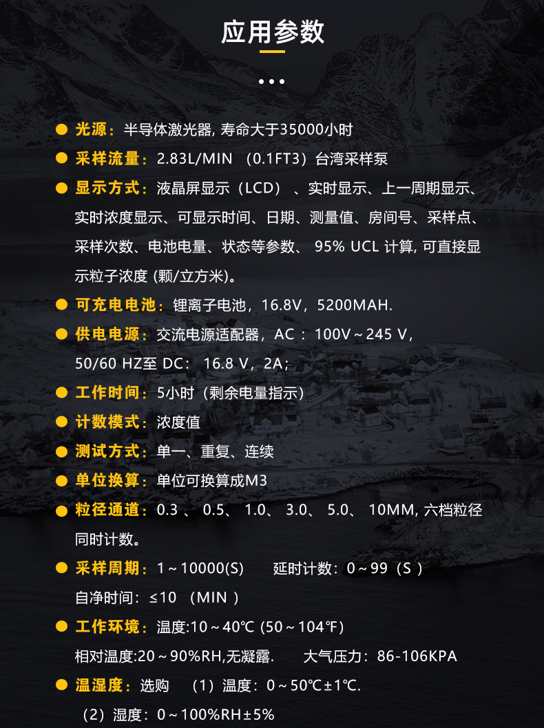 用于测量洁净环境中单位体积空气内的尘埃粒子大小及数目,可直接检测洁净度等级为十级至三十万级的洁净环境。