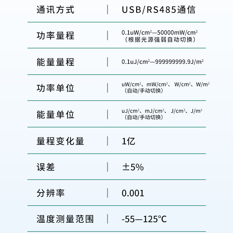 0.1uw/cm²-5万mw/cm²(根据光源强弱自动切换单位) |