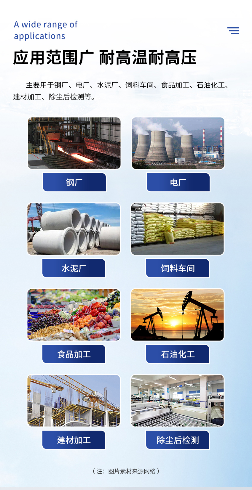 静电粉尘检测仪广泛应用于各种工业用途,包括:炼钢、发电、石油、化工、医药、建材加工、采煤和采矿、水泥制造和包装等行业。典型用途包括布袋除尘器滤袋破损的探测,或粉状材料回收、产品输送总量监测,或各种大小、各种燃料的锅炉烟尘排放浓度监测。