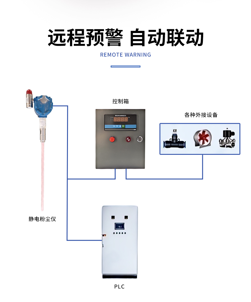 尘埃粒子与探头感应产生静电荷,通过探头进行信号放大并传送至监测控制系统。静电荷的大小与尘埃粒子的流量成比