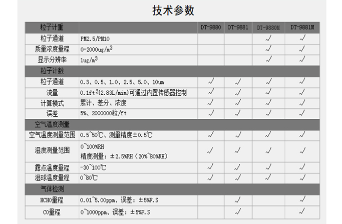 DT-9880型六通道,采样量 2.83L/min,具有视频和照片拍摄功能, 空气温湿度,露点和湿球温度测试功能。DT 系列的仪器具有自动关机功能、可选择采样时间的功能,同时可存储5000个数据记录(时间、数量、相对湿度、温度、样本容量、警报和地标),还可选择多种语言切换。该品牌旗下还有相关系列产品,DT-9880/9880M /9881等,下面大家可以看下对照表: