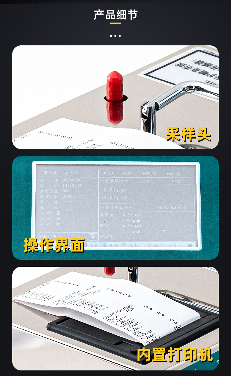 用于测量洁净环境中单位体积空气内的尘埃粒子大小及数目,可直接检测洁净度等级为十级至三十万级的洁净环境。