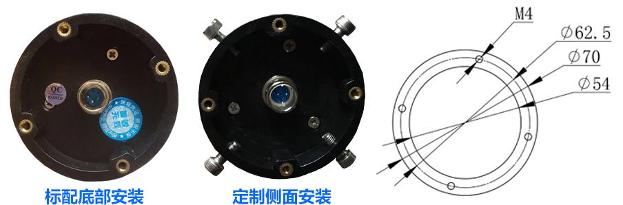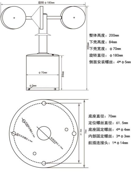 如图所示,风速底部都是嵌入铜内丝,防止腐化,生锈,后期易拆卸,底部使用4*8螺丝,将风速传感器固定在安装支架上面,需预留M23航线孔,将安航接头与连接线相连。