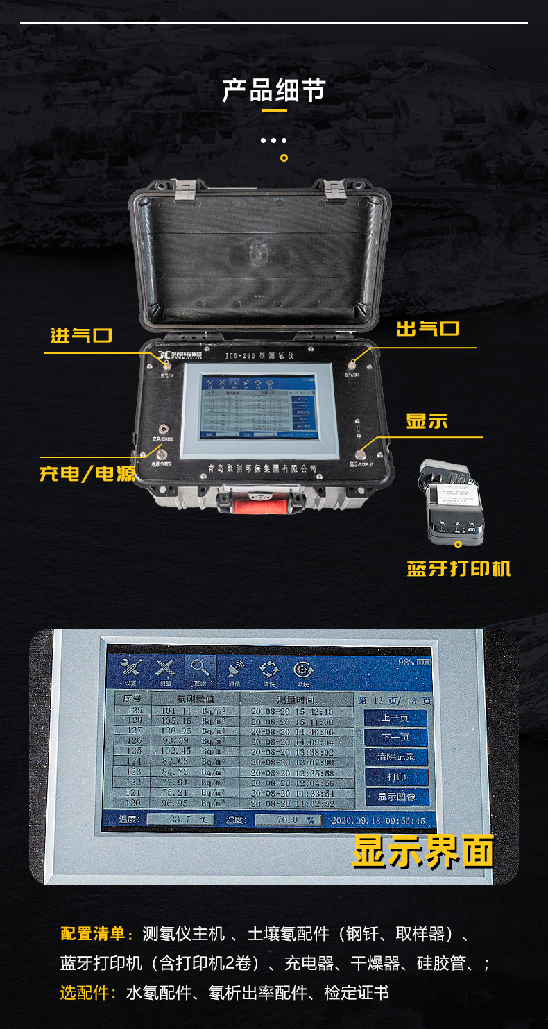 配置: 测氡仪主机 、土壤氡配件(钢钎、取样器)、蓝牙打印机(含打印机2卷)、充电器、干燥器、硅胶管、;选配件:水氡配件、氡析出率配件、检定证书