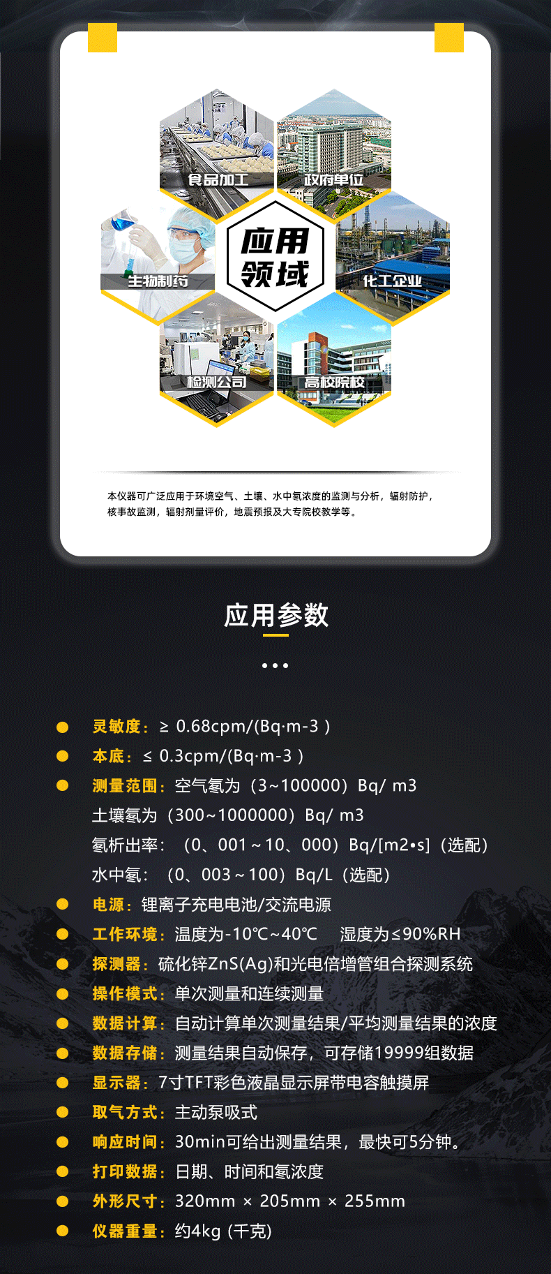 该仪器符合GB50325-2010《民用建筑工程室内环境污染控制规范》和 GB/T16147-1995《空气中氡浓度的闪烁瓶测量方法》的测量原理和要求。可用于环境空气、土壤、水中氡浓度的监测与分析,辐射防护,核事故监测,辐射剂量评价,地震预报及大专院校教学等。
