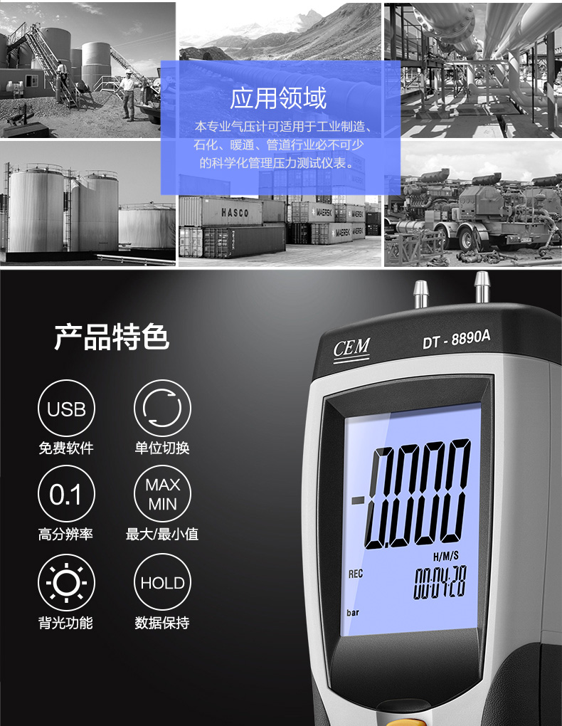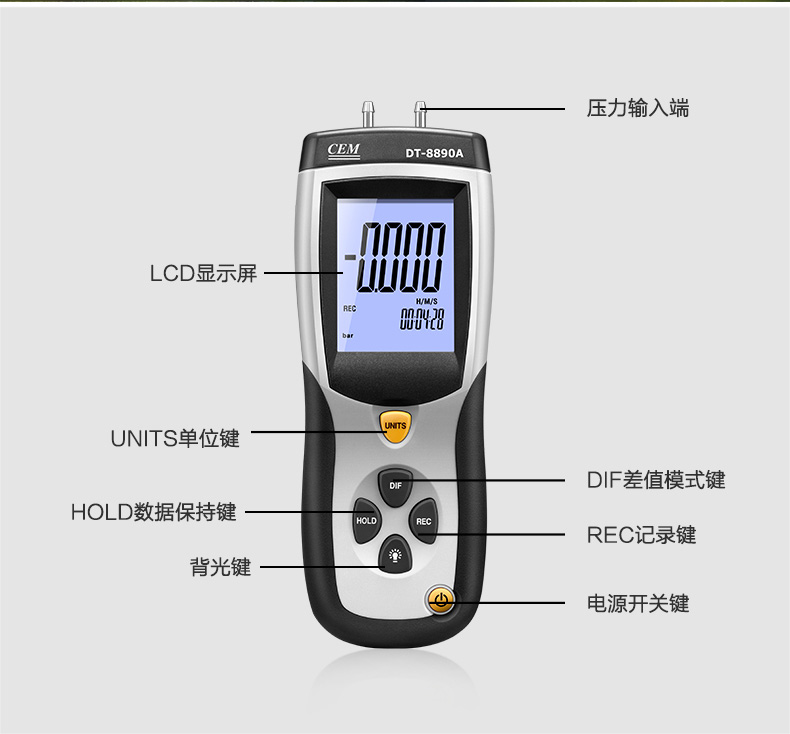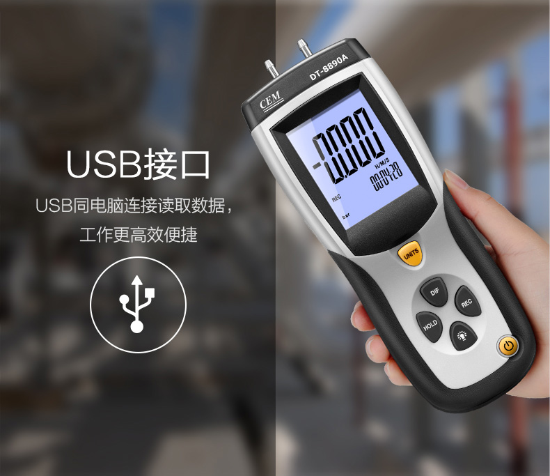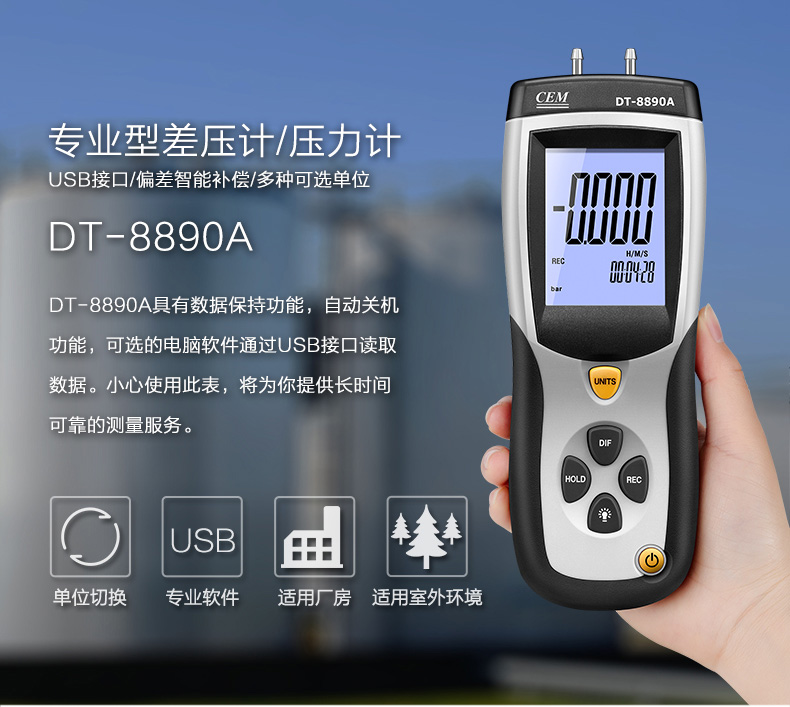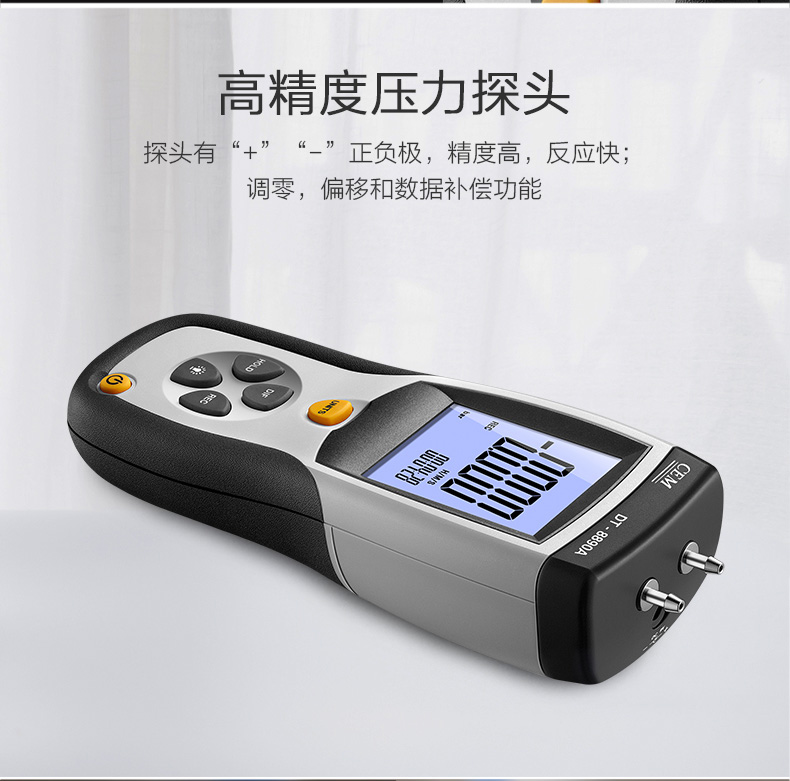 DT-8890/DT-8890A能测量0到±5psi的压差,11种可选压力单位:inH2O、psi、bar、mbar、kPa、inHg、 mmHg、ozin2、ftH2O、kgcm2。具有数据保持,大值/小值/平均值保持、调零、偏移和数据补偿。USB连接功能实现人机同步测量,以 及测量数据的保存和科学分析以便为每一项决策提供数据化依据。是工业制造、石化、暖通、管道行业不可或缺的科学化管理压力测试仪表。