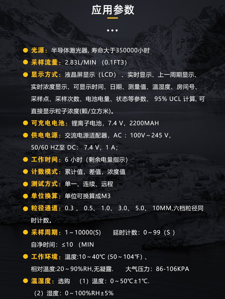 用于测量洁净环境中单位体积空气内的尘埃粒子大小及数目,可直接检测洁净度等级为十级至三十万级的洁净环境。
